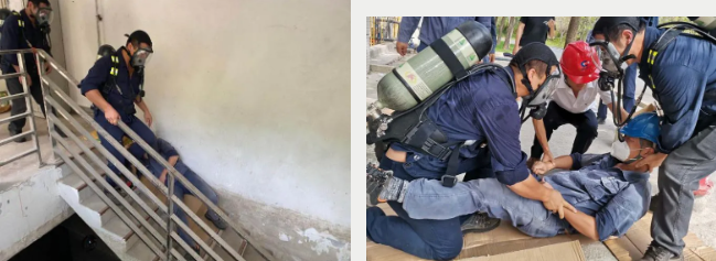演习以检修人员防护及准备不足,下到有毒气体聚积超标的渗滤液收集池后急性中毒窒息晕倒,室外监护人员发现情况,没有防护装备盲目救援遂也中毒晕倒为背景。