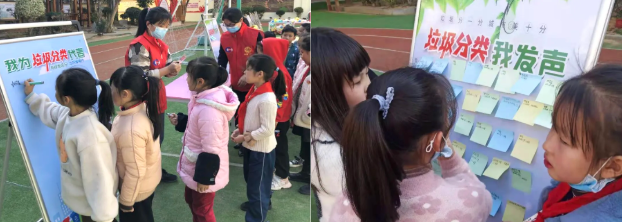 活动中,孩子们在志愿者的引导下,依次在“我为垃圾分类代言”板上签名,并记录下自己的垃圾分类“绿点子”,张贴到“垃圾分类我发声”展板上。学生在生动活泼氛围中读懂垃圾分类等环保知识,树立正确理念。