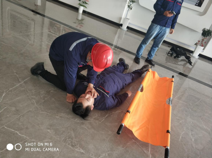 下午16时10分,随着消防报警器警报声响起,演练正式拉开帷幕。李录军总监一声令下,各小组人员迅速进场。抢险组正确佩戴正压式消防呼吸器后,进入事发地将火源扑灭并在最短时间内将伤员抬至安全地带,救护组立即采取心肺复苏术、人工呼吸等措施紧急施救。其他各小组也有序组织疏散、警戒和善后等工作。