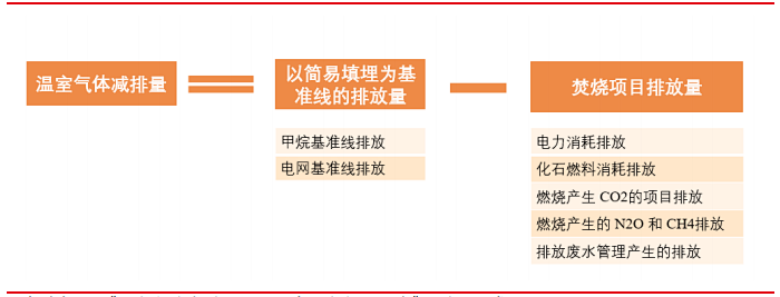 焚烧发电项目基准线排放包括替代垃圾填埋产生的CH4排放以及替代火力发电相同电量产生的排放,共2个要素。
