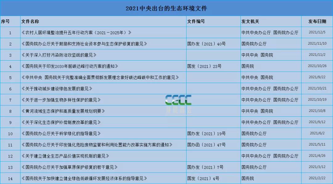 2021年是“十四五”开局年,也是碳中和元年,注定大风不断。一年来,中央有关生态环保相关的重要文件已经陆续亮相,国家对今后一段时间减污降碳、绿色发展等重点工作进行了系列部署。环境商会整理汇编了今年来中央出台的生态环境相关文件,并摘取官方重点解读内容,以飨读者,后续还将推出部委及地方生态环境文件汇编,敬请期待。