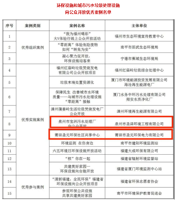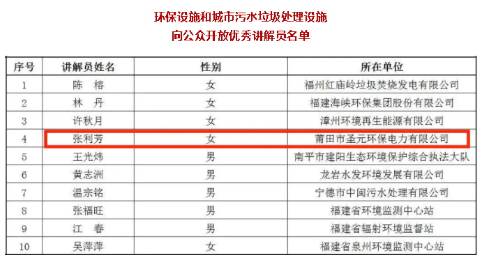 近日,福建省生态环境厅、福建省住房和城乡建设厅公布环保设施和城市污水垃圾处理设施向公众开放优秀案例、优秀讲解员入选名单 。“泉州市宝洲污水处理厂向公众开放”、“莆田8868体育社区共享中心”被评为环保设施向公众开放优秀案例,莆田8868体育张利芳被评为环保设施向公众开放优秀讲解员。