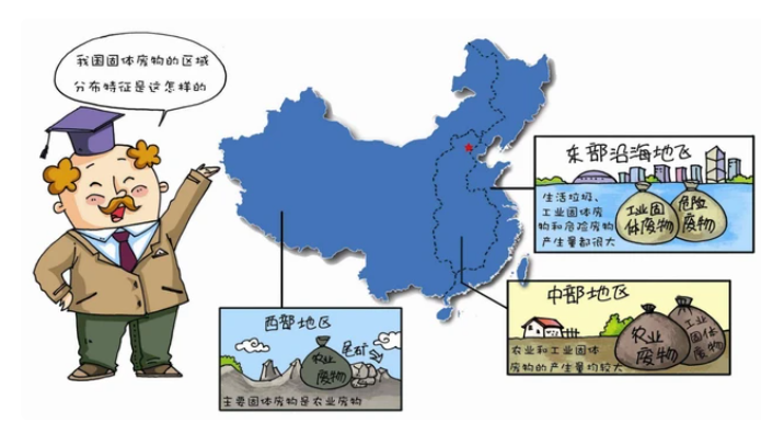 固体废物主要包括生活垃圾、工业固体废物、农业固体废物和危险废物。就地域而言,我国东部沿海地区经济发达,人口众多,城镇化水平高,生活垃圾、工业固体废物和危险废物产生量都很大;中部地区经济发展相对较慢,农业生产比较发达,也有很多工矿企业,农业和工业固体废物的产生量均较大;西部地区相对来说发展比较慢,城镇化水平较低,农业以畜牧业为主,因此生活垃圾和工业固体废物产生量相对较少,主要固体废物是农业废物。矿产资源丰富的地区,废矿石和尾矿的产生量较大。