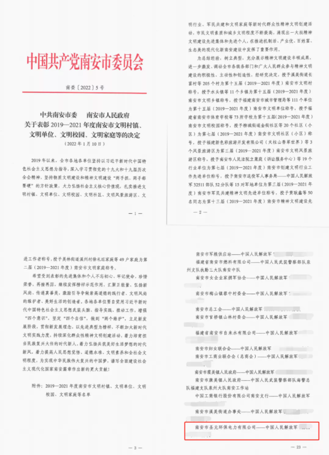 日前,中共南安市市委、南安市人民政府发布《关于表彰2019-2021年度南安市文明村镇、文明单位、文明校园、文明家庭等的决定》,南安8868体育榜上有名,获评“军民共建精神文明先进单位”,是全市唯一一家荣获此称号的民营企业单位。