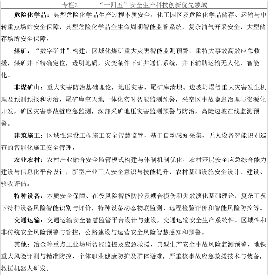 聚焦重特大事故形成机理和演化规律、复合灾害事故风险防范与应急救援等重大理论问题,实施重大事故防范、重大基础设施安全风险评估等国家科技计划项目,深化风险智能感知和监测预警理论与方法研究。优先发展信息化、智能化、无人化的安全生产风险监测预警装备,重点提升安全生产危险工艺设备的机械化自动化水平,着力破解重大安全风险的超前预测、动态监测、主动预警等关键技术瓶颈。健全与研发平台配套的安全生产科技支撑链条,培育和创建国家级安全生产科技创新平台。依托现有机构完善危险化学品安全研究支撑平台。加快推进安全生产国家级重点实验室、技术创新中心、协同创新中心、战略理论政策智库创建,推动安全生产科技创新资源开放共享,形成基础研究、技术创新和应用研究贯通发展的安全生产科技创新生态。建立安全生产装备与服务需求信息平台、技术创新转化交易平台,优化安全生产科技支撑服务市场化运行机制。推广安全风险分级管控和隐患排查治理技术装备,加强重点行业领域先进技术装备的推广应用。