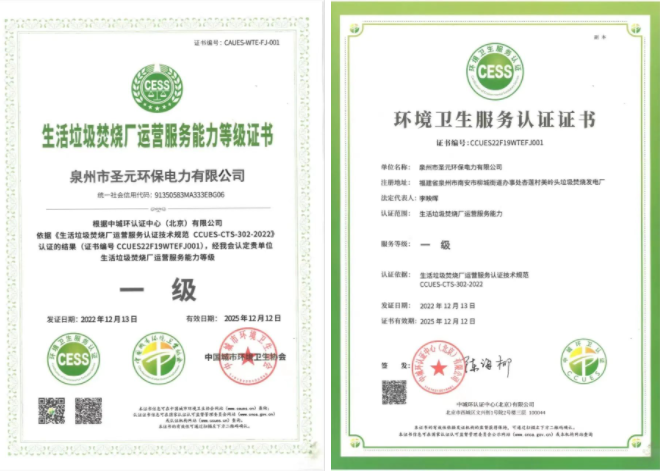 近日,泉州市8868体育电力有限公司(以下简称“泉州8868体育”)获得中城环认证中心颁发的生活垃圾焚烧厂运营服务能力认证证书(服务等级:一级),中国城市环境卫生协会对该认证结果予以认定。此举表明泉州8868体育在服务管理、服务特性、服务能力等方面均为垃圾焚烧电厂中的佼佼者。