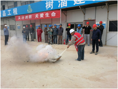上午09:00时,工地现场施工人员发出火警报警信号。各演练工作组在听到指令后,迅速到位,在最短的时间内,于车间内、楼梯间及安全出口处,通过口令加手势,指挥员工从指定路线进行有秩序疏散,把现场所有人员快捷有序地疏散到安全地带后,进行人员的清点统计。项目部安全员王龙向大家详细了讲解了灭火器的使用方法和注意事项,随后指导施工人员使用灭火器进行灭火。