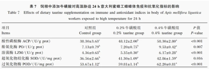 1.饲粮中添加牛磺酸对高温胁迫下7日龄意大利蜜蜂工蜂生长发育的影响