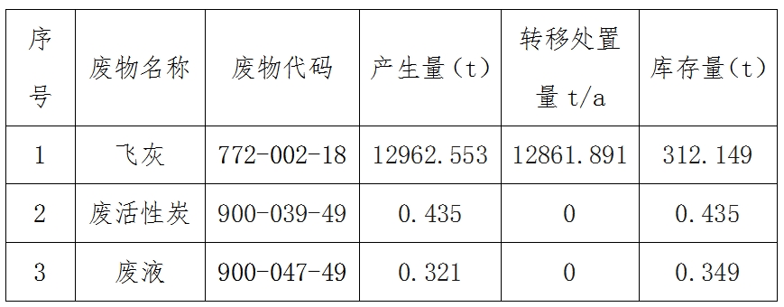 1、飞灰。生活垃圾焚烧产生,暂存于飞灰固化养护车间,定期统一转运至配套的填埋场填埋处理。
