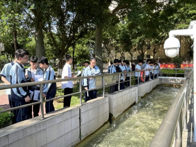在办公楼,林志辉厂长发放环保宣传手册,结合上墙工艺流程图简要讲解了生活污水处理流程。随后,庄俊兵副厂长带领学生实地参观生物池、二沉池、高密度澄清池与精密过滤器房等污水处理设施,详细介绍污水处理的各个工艺段。同学们对污水处理的后续流程,如污泥的处理和深度处理环节,表现出了浓厚的兴趣。在出水明渠旁,原本浑浊发臭的污水已经变得清澈透明,同学们纷纷举起手机定格这一瞬间。