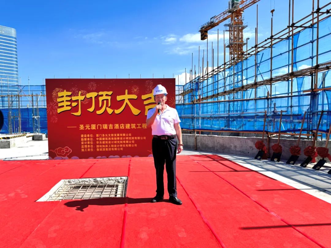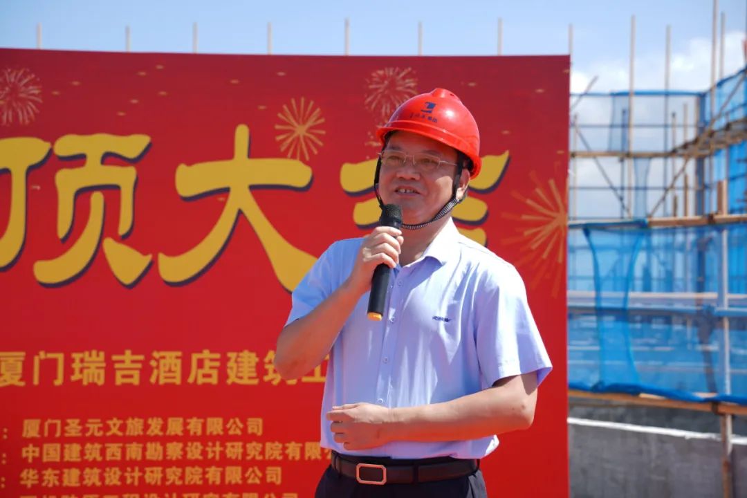 活动伊始,朱煜煊董事长发表开幕致辞,对参建各方工作人员的辛勤付出致以诚挚感谢。朱煜煊董事长表示,项目圆满完成主体封顶这一重要节点,各位嘉宾及参建单位代表齐聚塔楼屋面俯瞰鹭岛海岸线,眺望建设中的厦金大桥,共同见证封顶大吉。接下来,参建各方要以更高标准全力冲刺装饰装修与运营筹备,确保2026年底试营业,2027年上半年正式运营。