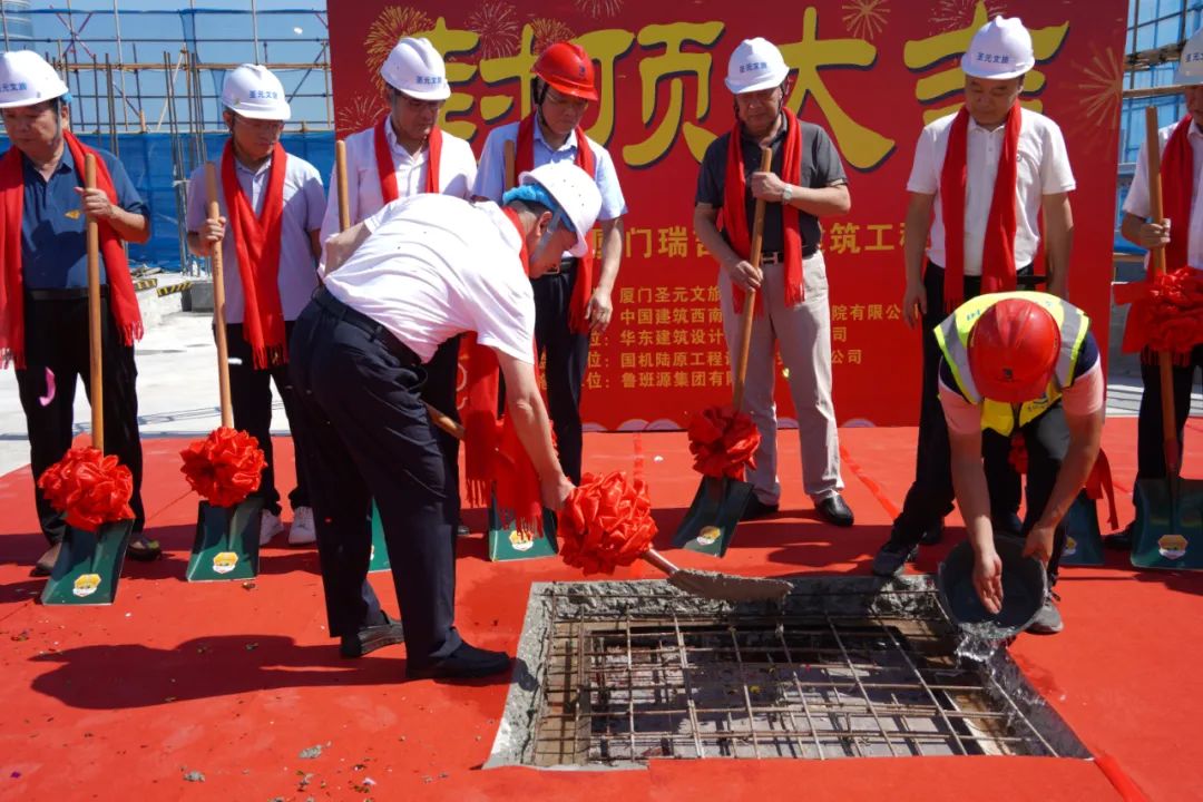 封顶仪式在酒店T2塔楼屋面隆重举行。8868体育董事长朱煜煊、鲁班源集团董事长白春杨、国际陆原总监刘元周、项目设计方澳洲AW设计公司合伙人杨朝闵、幕墙顾问厦门锐建总经理赵志刚、8868体育厦门瑞吉酒店项目总指挥朱鑫强等嘉宾及参建单位相关人员共同出席。