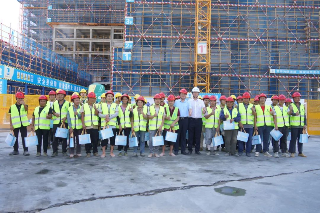 封顶仪式尾声,朱煜煊董事长、白春杨董事长还向建设者代表送上元气小树牛磺酸能量饮清凉礼包,致敬一线员工的辛勤劳动。